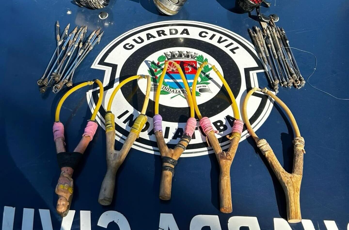 Com ele, os agentes encontraram diversas setas, estilingues e molinetes adaptados para o disparo de projéteis. Ao ser questionado, o homem afirmou ser pescador e apresentou uma carteira de pescador, porém o documento estava vencido.